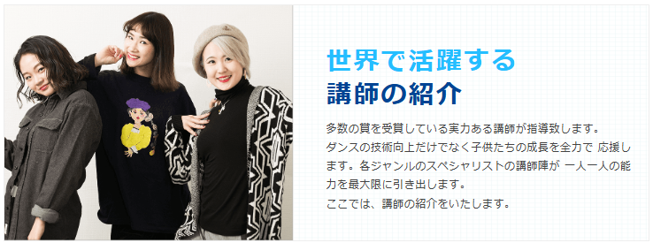 ダンスのスキルと経験が豊富で、世界で活躍している実力派の講師がレッスンを行っています。さらに、子どもたちの成長に寄り添った丁寧な指導法で、子どもたちの個性や素質を引き出してくれます。